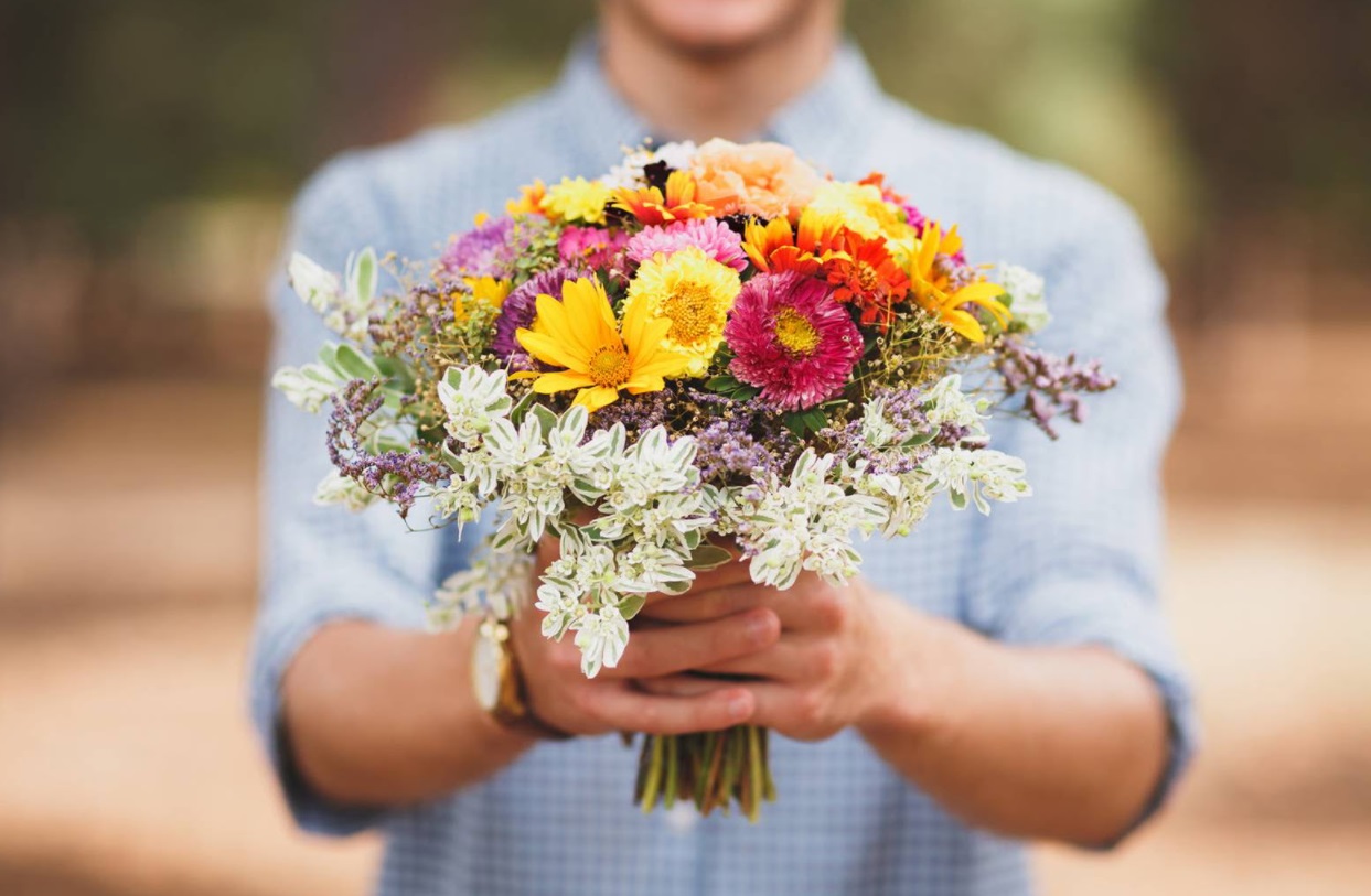 Mann mit Blumenstrauß (Symbolbild)
