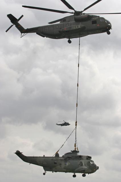 Ein SEA KING Hubschrauber des Marinefliegergeschwadres 5 aus Kiel-Holtenau wird nach einer Sicherheitslandung auf dem Truppenübungsplatz bei Langwedel zur Instandsetzung mit einem CH 53 Hubschrauber des Heeres nach Kiel geflogen. Ein weiterer SEA KING begleitet den Transport. Bild: Pia Höppner
