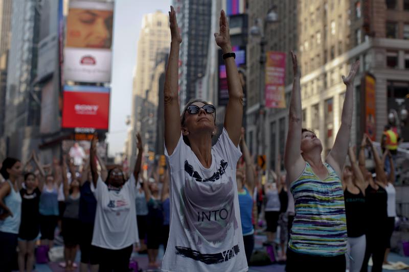 Sonnengruß zur Sommersonnenwende auf dem Times Square in New York: Alte spirituelle Lehren, wie etwa Yoga, sind in der westlichen Welt weit verbreitet. Aber auf dem Weg in die Moderne gingen viele spirituellen Elemente und Ideen verloren. Quelle: Corbis (idw)