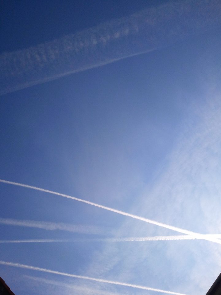 Sogenannte Chemtrails, persistente Kondensstreifen im Zuge der illegalen GeoEngineering-Maßnahmen - fotografiert über Bad Nauheim im Juni 2014
