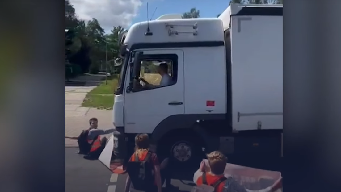 Etwa einen Meter schob der Lkw den Klimakleber im Juli in Stralsund vor sich her. Bild: Screenshot: VK.com / RT DE
