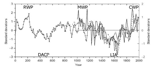 Darstellung verschiedener standardisierter Temperaturverläufe im ariden Zentralasien