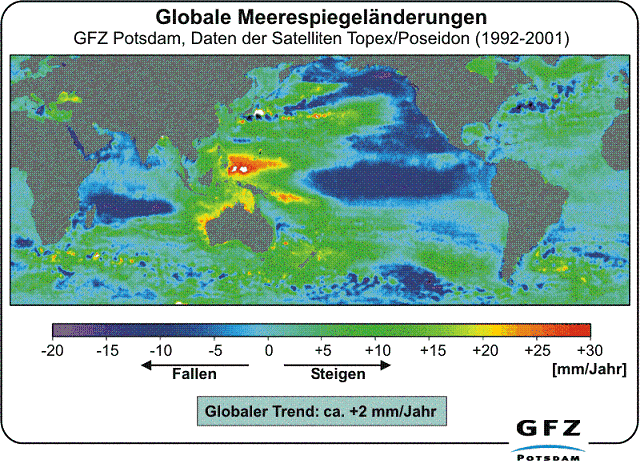 Nach den Messungen der Satelliten-Radarsysteme TOPEX/POSEIDON sind die Meeresspiegel-Änderungen im Golf von Bengalen einerseits geringfügig und andererseits keineswegs einheitlich, wie die Abbildung zeigt. Grafik: EIKE