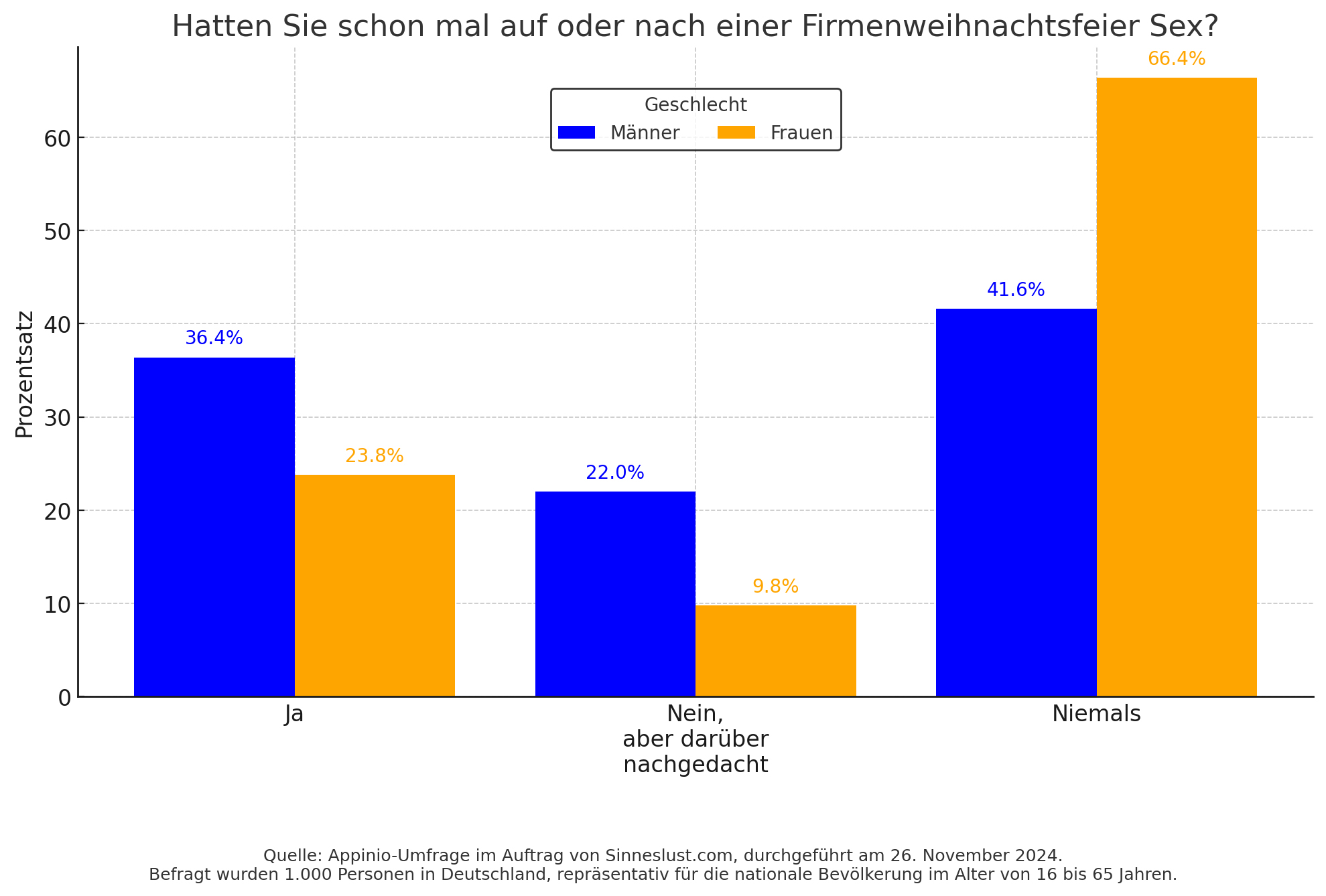 Eine Studie von Sinneslust.com deckt auf, dass knapp ein Drittel der Deutschen schon mal Sex auf der Firmenweihnachtsfeier hatte.