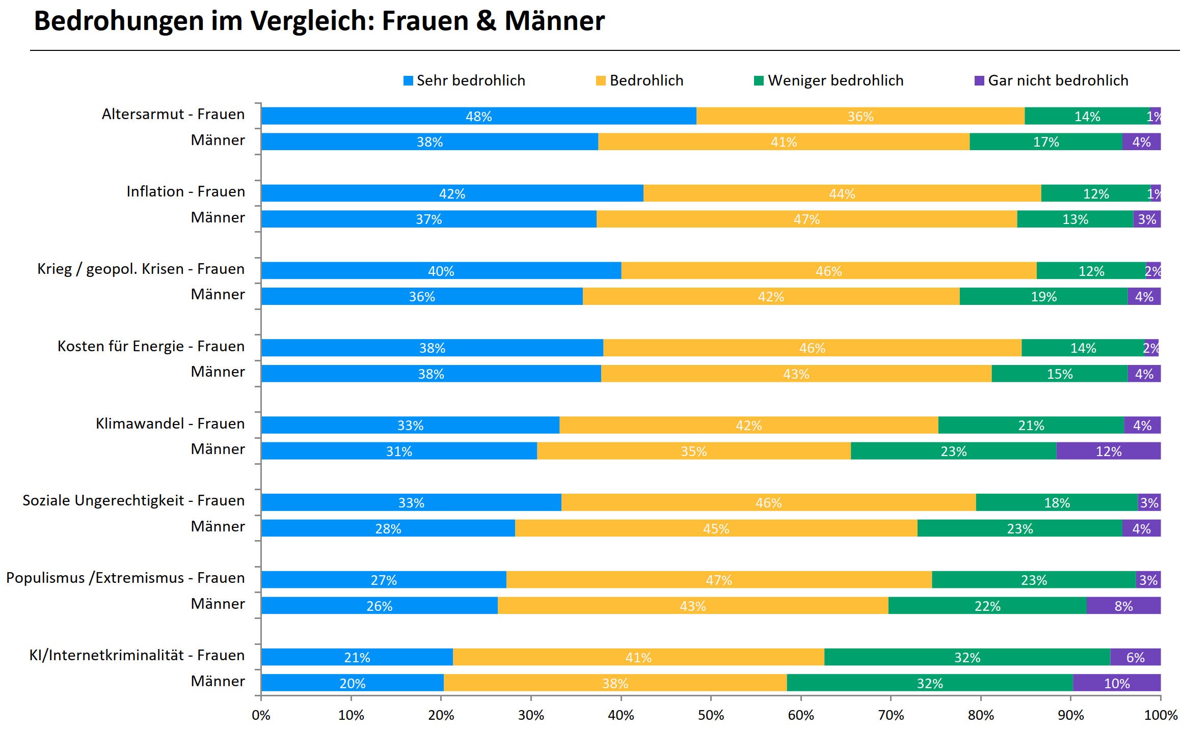 Zwei Drittel der Frauen in Deutschland haben große Sorge vor Altersarmut, gefolgt von Inflation, geopolitischen Krisen und Kosten für Energie. Quelle: Finanzbarometer von J.P. Morgan Asset Management, eine repräsentative Online-Befragung von je 1.000 Frauen und Männern ab 20 Jahren in Deutschland.