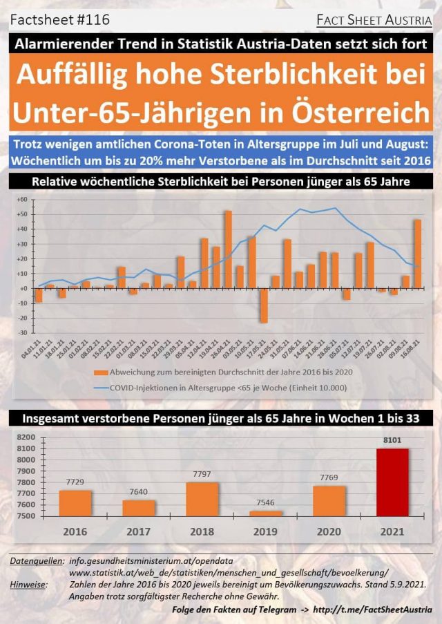 Zurück zu Verursacht durch Impf-Nebenwirkungen? Alarmierend: Sterbezahlen der unter 65-Jährigen wochenweise bis zu 20% gestiegen
