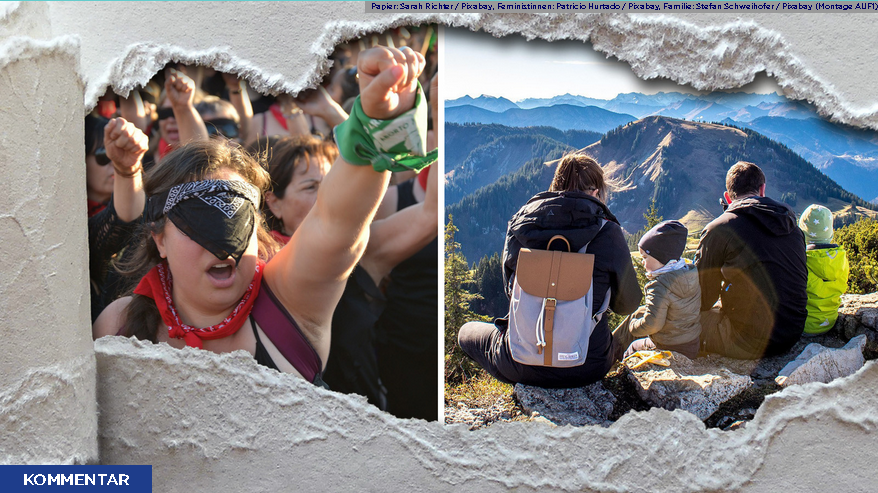 Bild: Papier: Sarah Richter / Pixabay, Feministinnen: Patricio Hurtado / Pixabay, Familie: Stefan Schweihofer / Pixabay (Montage AUF1) / Eigenes Werk