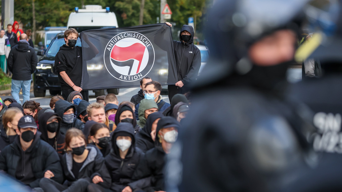 03. Oktober 2022, Sachsen, Leipzig: "Linke" Gegendemonstranten des Bündnisses "Leipzig nimmt Platz" blockieren eine Demonstration mit dem Motto "Für Frieden, Freiheit und Selbstbestimmung".
