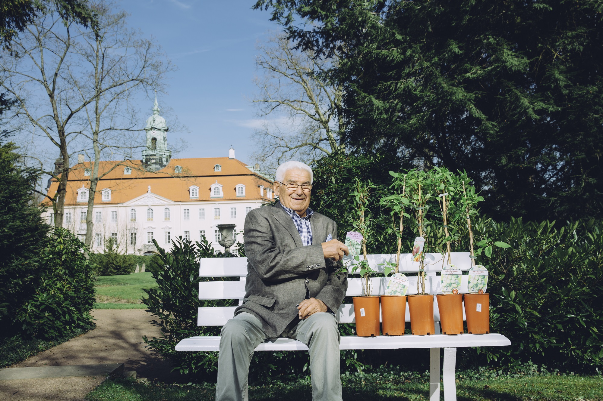 Werner Merkel präsentiert seine Kiwipflanzen im Schlosspark Lichtenwalde bei Chemnitz. Bild: "obs/Schlösserland Sachsen/Oliver Killig"