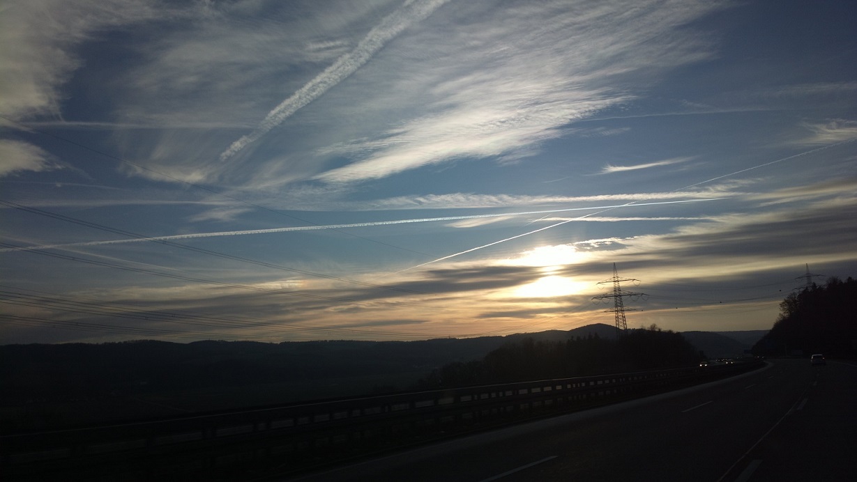 Frisch versprühte persistente Kondensstreifen und ein trüber milchiger Himmel über Eisenach am 12. Januar 2014