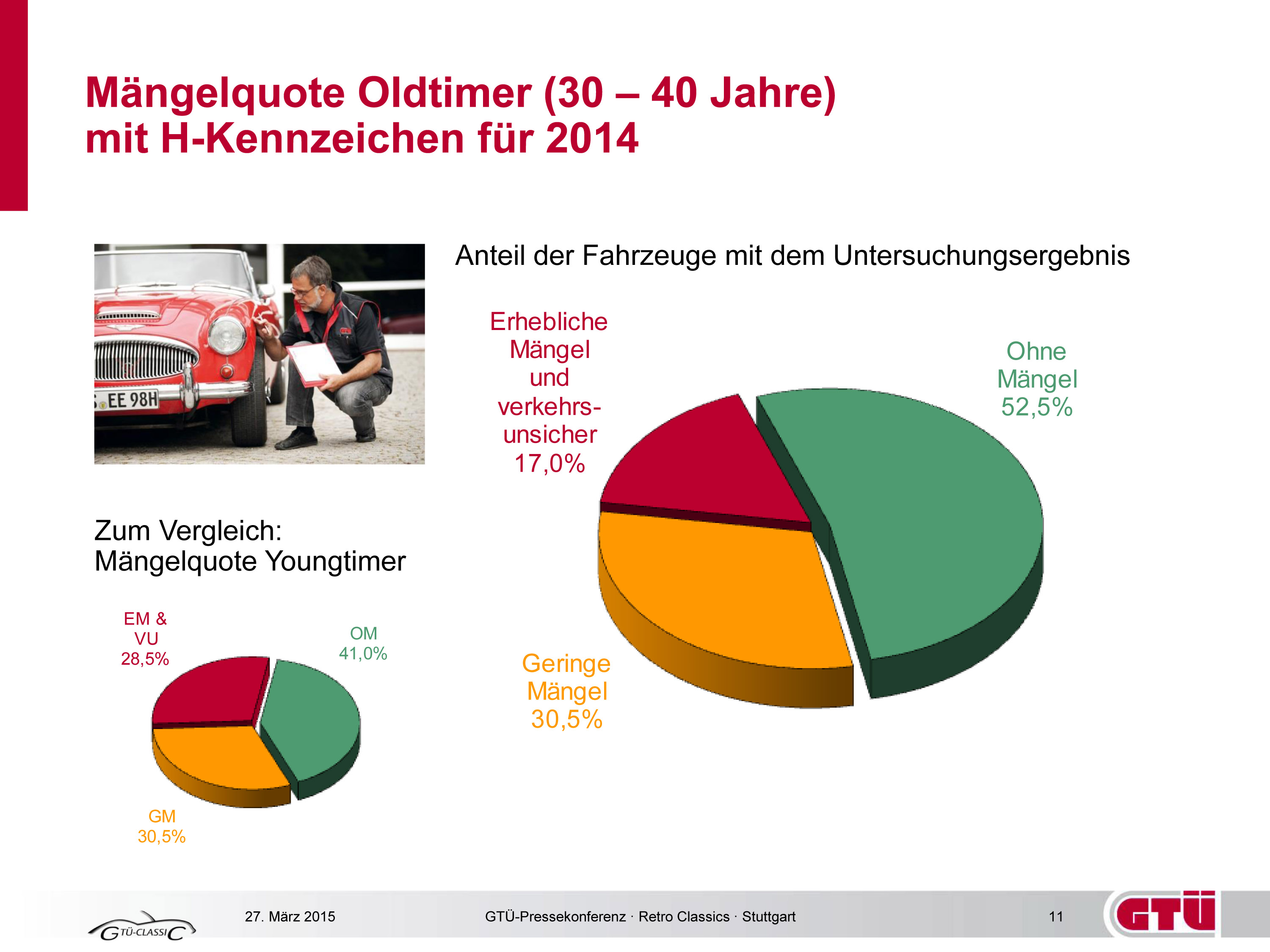 Mängelquote Oldtimer (30 - 40 Jahre) mit H-Kennzeichen für 2014: Anteil der Fahrzeuge mit dem Untersuchungsergebnis. Bild: "obs/Grafik: Kröner/GTÜ · 03/2015"