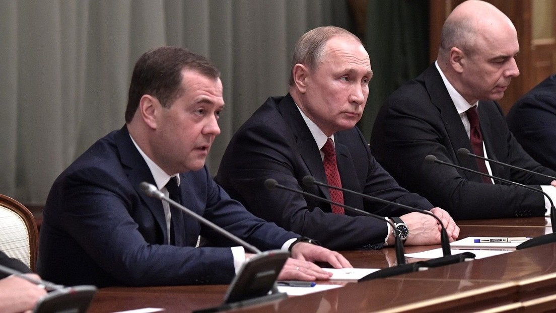 Dmitri Medwedew (links), damals noch Premierminister während einer Regierungssitzung mit dem Präsidenten Wladimir Putin und Finanzminister Anton Siluanow, Januar 2020. Bild: RTDE