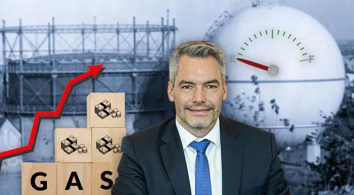 Bild: Hintergrund (Symbolbild): Friedrich Magnussen / Gesellschaft für Kieler Stadtgeschichte, Wikimedia Commons, CC BY-SA 3.0 DE; Nehammer: BKA, Wikimedia Commons, CC BY 2.0; Gaspreis: Freepik; Füllstandanzeige: Pixabay; Collage: Wochenblick / Eigenes Werk