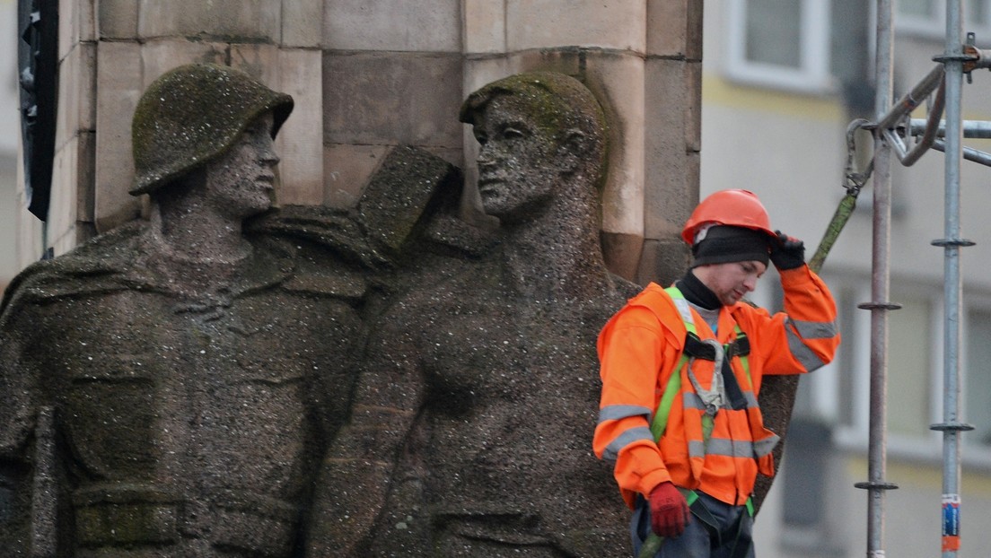 Im Bild: Ein Arbeiter bereitet das Denkmal zum Dank an die Rote Armee in Stettin, Polen, für den Abriss vor. Bild: Sputnik / Алексей Витвицкий / Ria Novosti