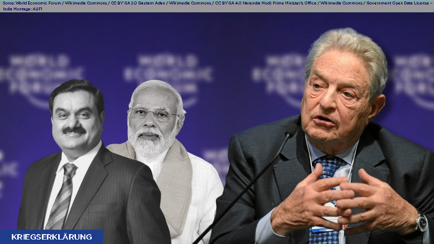 Bild: Soros: World Economic Forum / Wikimedia Commons / CC BY-SA 2.0 Gautam Adan / Wikimedia Commons / CC BY-SA 4.0 Narendra Modi: Prime Minister's Office / Wikimedia Commons / Government Open Data License – India Montage: AUF1 / Eigenes Werk