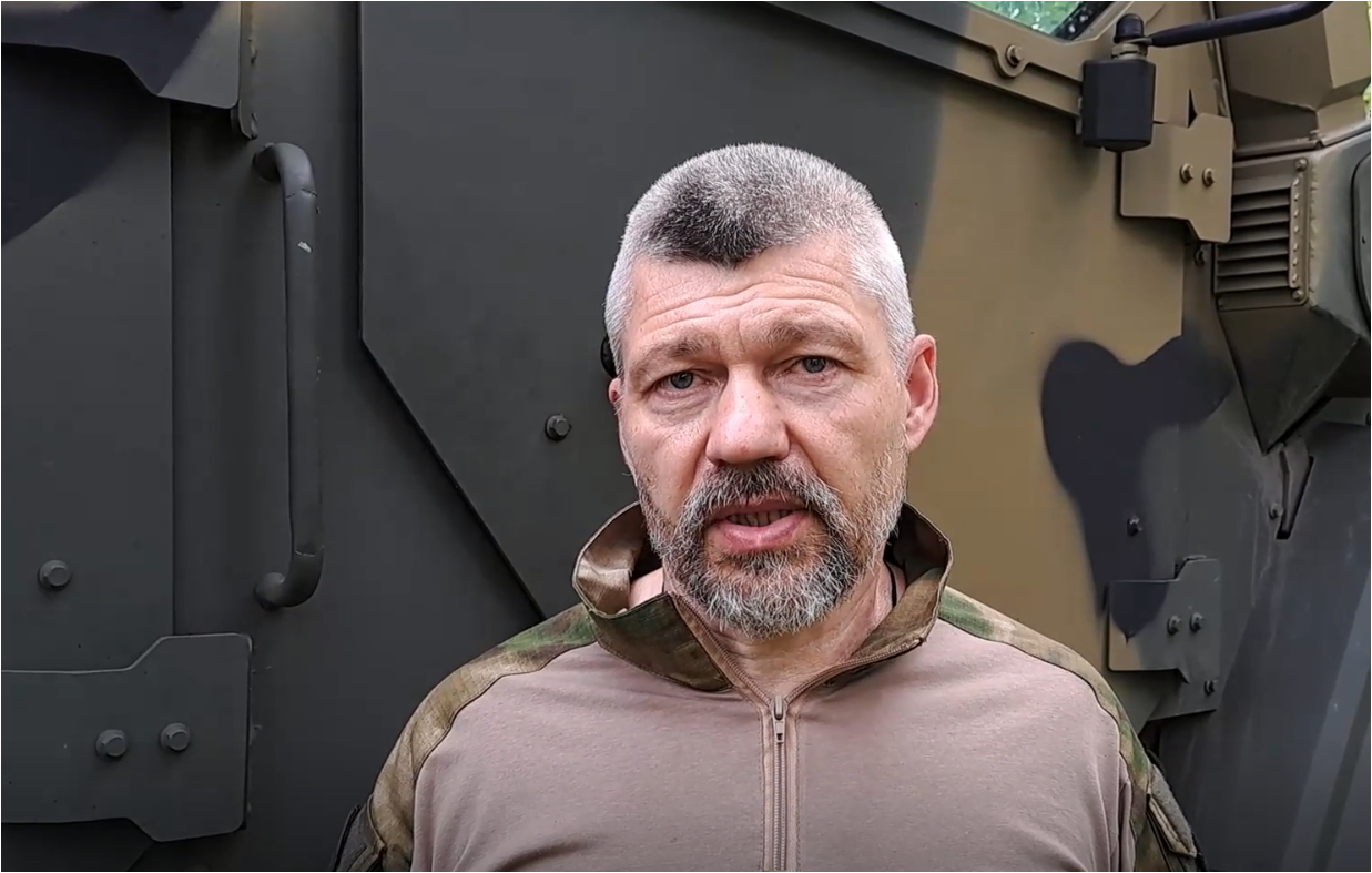 Funkname Stavr, Kommandeur des freiwilligen Kosakenbataillons für Saboage und Aufklärung "S.K.I.F." der "Terek"-Brigade der Kosakentruppen der russischen Volksrepublik Donezk. Stillbild aus TASS-Videointerview. Bild: TASS