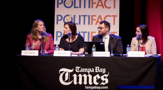 St. Petersburg, Florida, USA. Von links: Amy Hollyfield, Redakteurin der Tampa Bay Times, Angie Holan, Redakteurin bei Politifact, Aaron Sharockman, leitender Redakteur bei Politifact, und Katie Sanders, Redakteurin bei Politifact. 2016 Politifact Forum