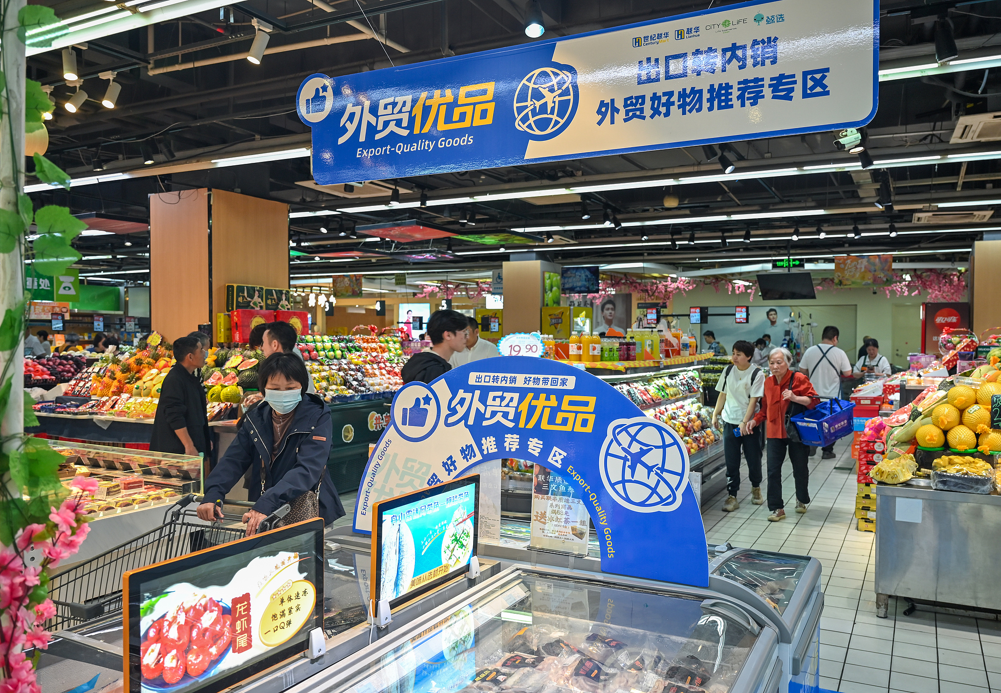 People shop at a special area for foreign trade premium products at a supermarket in Hangzhou, east China's Zhejiang Province, April 23, 2025. Bild: VCG