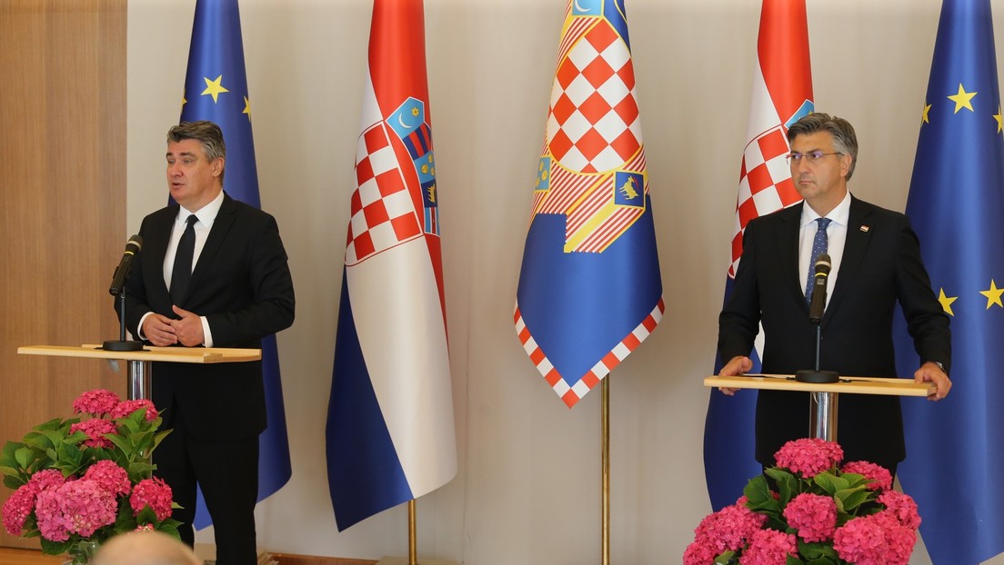 Kroatiens Präsident Zoran Milanović (l.) und Ministerpräsident Andrej Plenković bei einer Pressekonferenz nach einem Treffen im Präsidialamt in Zagreb, Kroatien, 16. Juli 2020.