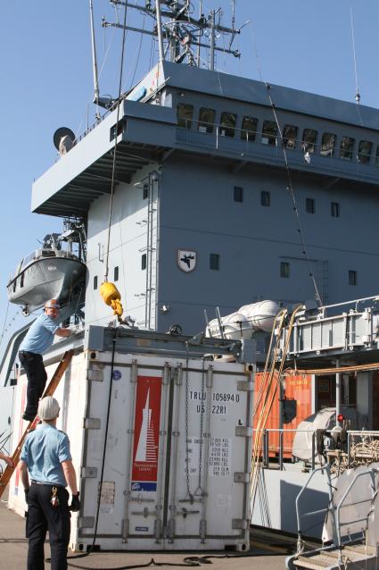 Die Kühlkontainer werden auf den Tender geladen alle Bilder (c) PIZ Marine, Fotograf: Ann-Kathrin Fischer