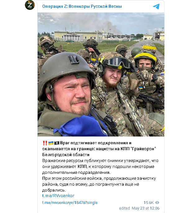 Ukrainische Soldaten machen Selfies im russischen Dorf Kosinka nahe dem Grenzposten Graiworon Bild: SS Video: "https://t.me/rvvoenkoryv/18476" / Eigenes Werk