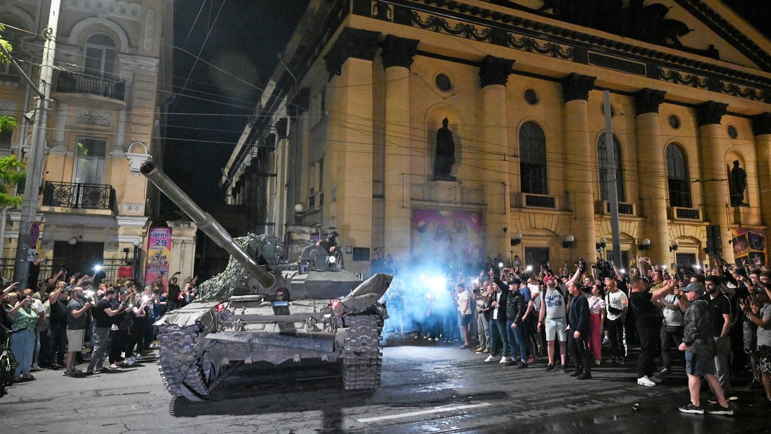 Die versammelten Rostower umzingeln einen Wagner-Panzer vor dem Zirkus-Gebäude am Woroschilowski-Prospekt. Bild: Sputnik / Segrei Piwowarow
