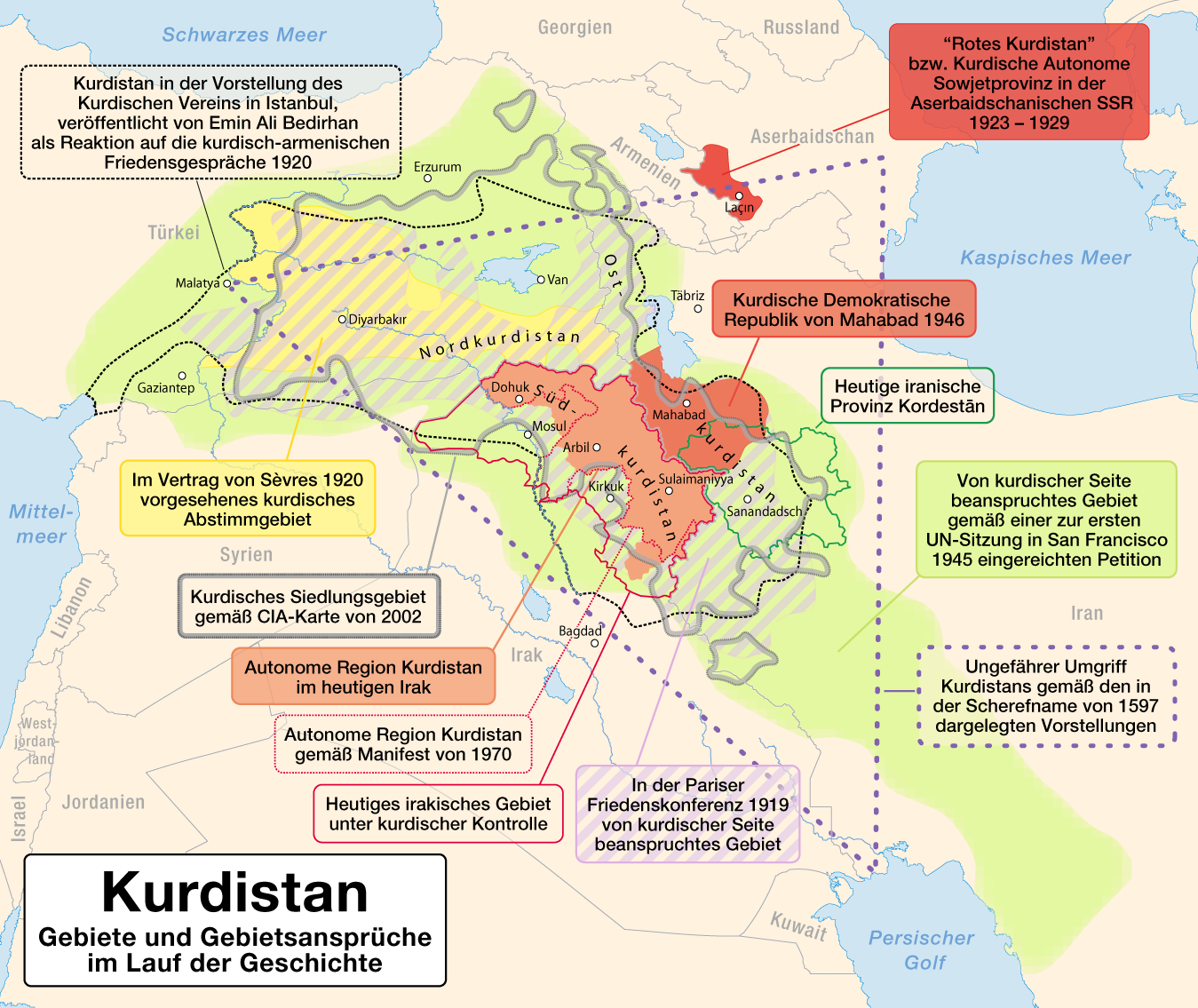 Ausdehnung Kurdistans und Gebietsansprüche im Laufe der Geschichte. Als Kurdistan wird ein nicht genau begrenztes Gebiet in Vorderasien bezeichnet, das als historisches Siedlungsgebiet von Kurden betrachtet wird.