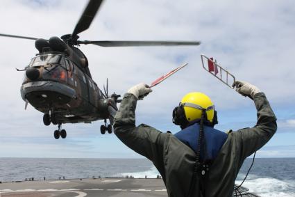 Auf der Fregatte BRANDENBURG landen Hubschrauber der Südafrikanischen Navy vom Typ ORYX. Bild: Ricarda Schönbrodt / Marine