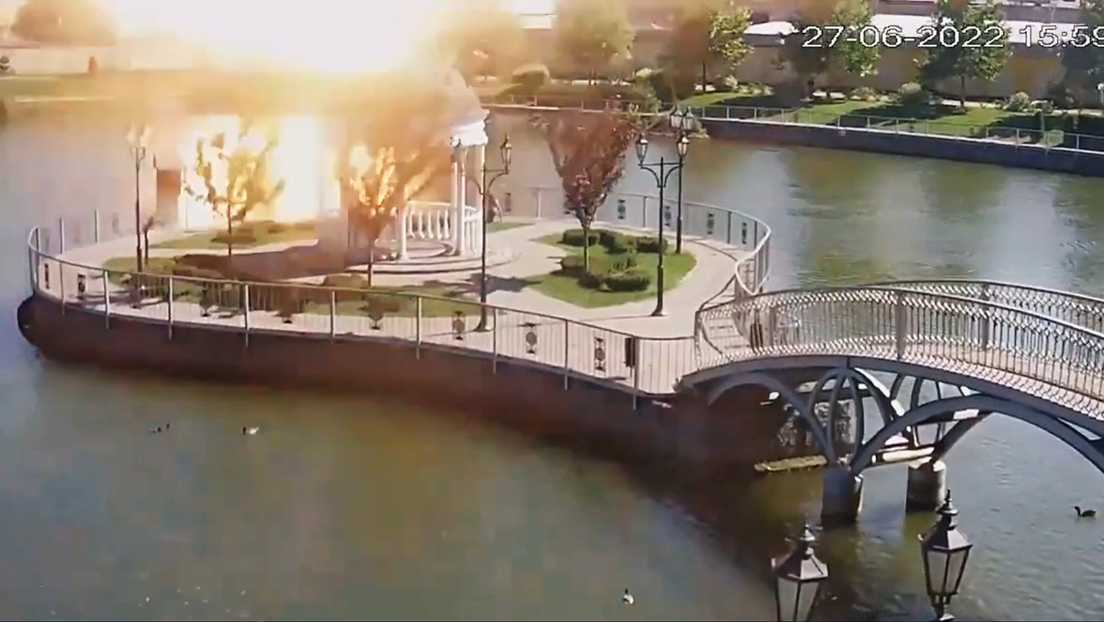 Die Momentaufnahme eines Überwachungsvideos zeigt einen Raketeneinschlag auf einen Hangar der Straßenmaschinenfabrik "Kredmasch"