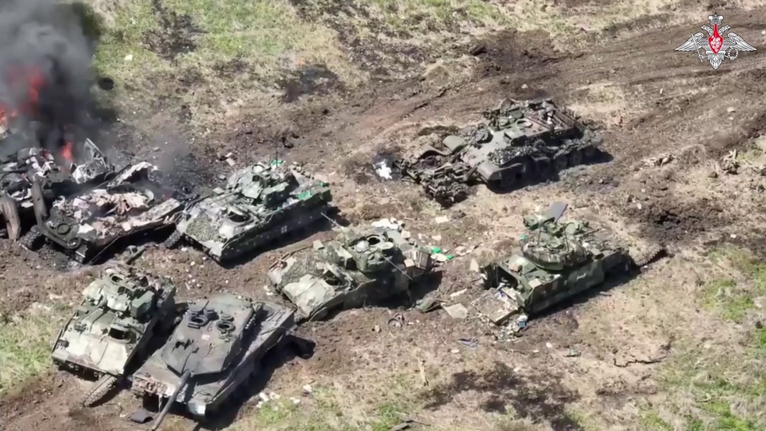 Screenshot aus einem Video des russischen Verteidigungsministeriums: Zerstörte westliche Panzer und gepanzerte Fahrzeuge auf einem Feld im Gebiet Saporoschje Bild: Russisches Verteidigungsministerium