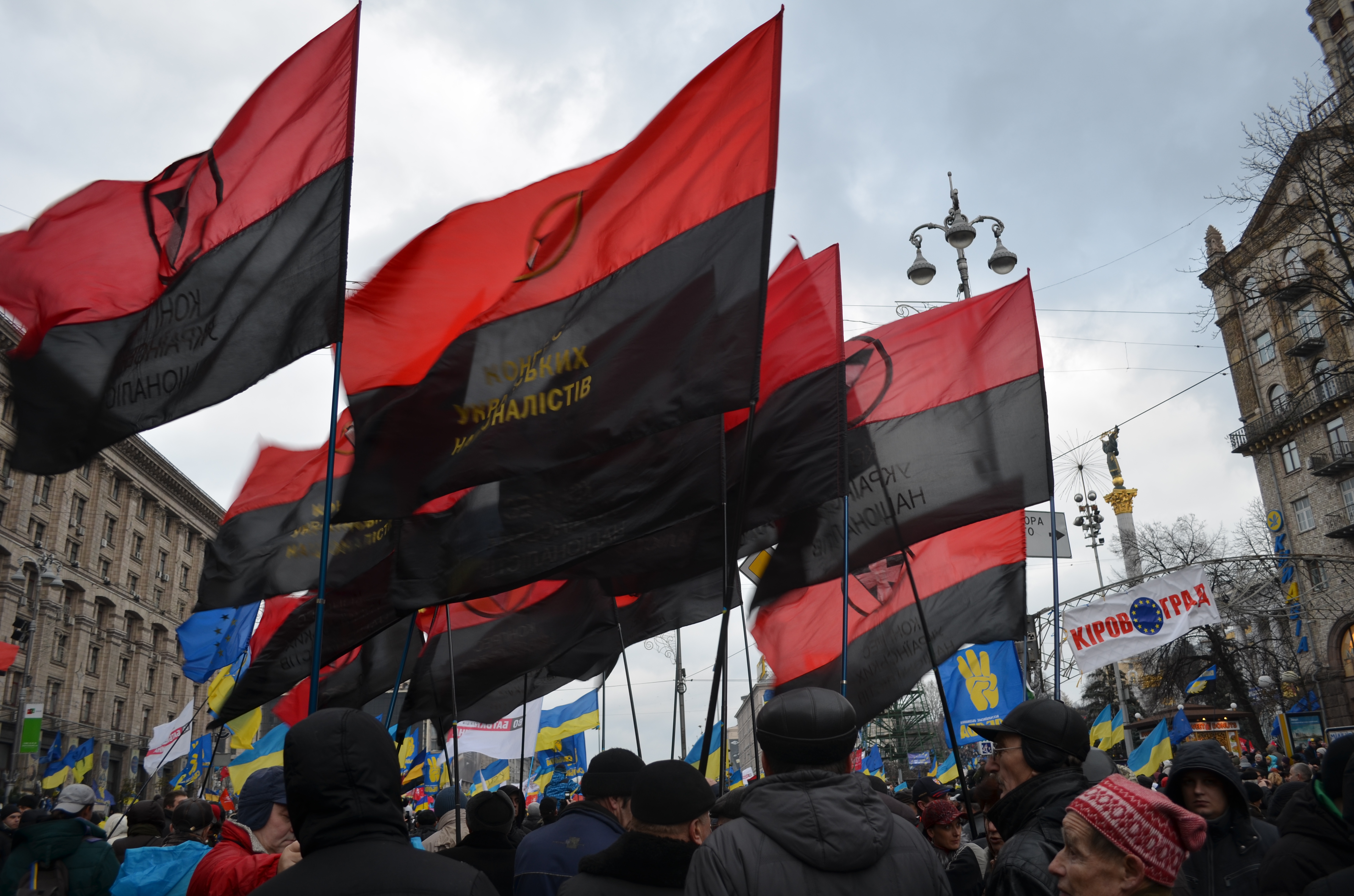 Schwarz-rote Fahnen des KUN bei Demonstrationen des Euromaidan am 1. Dezember 2013 in Kiew.