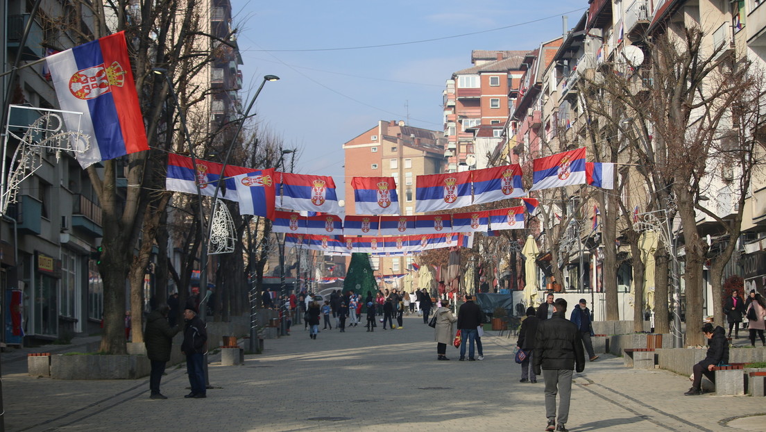 Blick auf eine Straße in Mitrovica, Nord-Kosovo, am 30. Dezember 2022, die mit serbischen Fahnen für die Neujahrsfeierlichkeiten geschmückt ist. Bild: Gettyimages.ru / Erkin Keci / Anadolu Agency