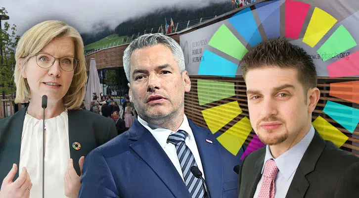 Bild: Gewessler: BMF/Wenzel; Nehammer: European People's Party (beide Wikimedia Commons, CC BY 2.0); Soros: Nathalie Schuller / Moran Wright, Wikimedia Commons, CC BY-SA 3.0; Alpbach: Simon Legner, Wikimedia Commons, CC BY-SA 4.0; Collage: Wochenblick / Eigenes Werk