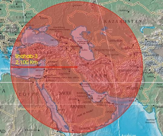 Reichweite der Shahab 3, eine weiterentwickelte nordkoreanische Mittelstreckenrakete, die sowohl militärisch als auch in einer erweiterten Version (Safir) für die iranische Weltraumorganisation Verwendung findet. Bild: wikipedia.org