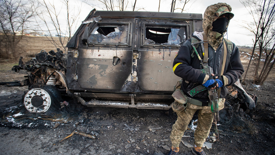 Ein ukrainischer Soldat steht neben einem ausgebrannten Fahrzeug. Bild: Gettyimages.ru / Scott Peterson
