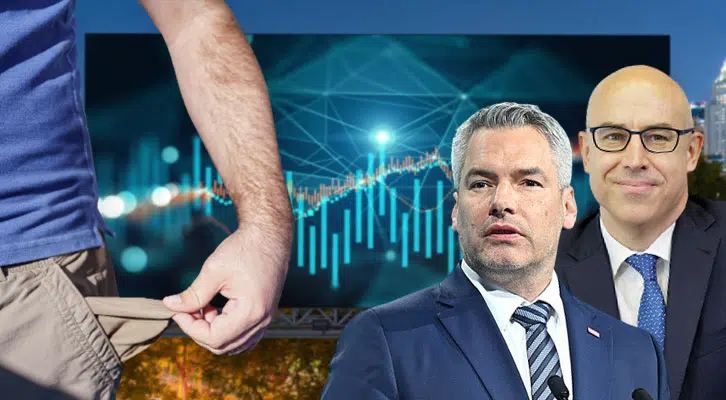 Bild: Mann & Prognose: Freepik (2); Nehammer: European People's Party; Felbermayr: BMF/Wenzel (beide Wikimedia Commons, CC BY 2.0); Collage: Wochenblick / Eigenes Werk