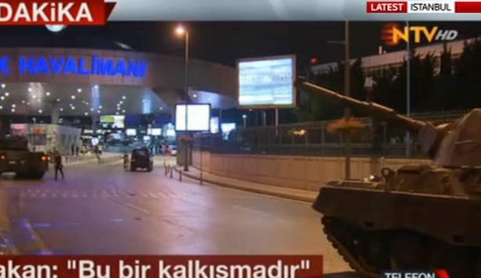 News report showing tanks approaching Istanbul's Atatürk Airport