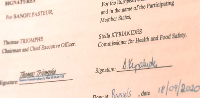 Der Vertrag mit Sanofi wurde ebenfalls unterzeichnet („Für die Europäische Kommission und im Namen der teilnehmenden Mitgliedsstaaten“) Bild: UM/ Eigenes Werk