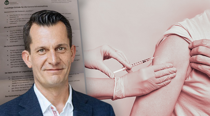 Bild: Symbolbild Covid-Spritze: Freepik; Mückstein: (C) Stefanie Freynschlag / Die Grünen, Wikimedia Commons, CC0; "Impfbrief": privat / zVg; Komposition: Wochenblick/Eigenes Werk