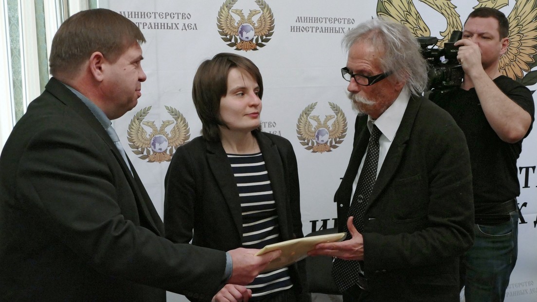 Archivbild: Anwalt und Menschenrechtsaktivist Witali Galachow übergibt seinem französischem Kollegen und Mitstreiter Josy-Jean Bousquet Dokumente zu Kriegsverbrechen in der Ostukraine. Donezk, 14.01.2016)