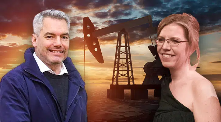 Bild: Ölpumpe: Freepik; Nehammer: Kmu.gov.ua, Wikimedia Commons, CC BY 4.0; Gewessler: Manfred Werner (Tsui), Wikimedia Commons, CC BY-SA 4.0; Komposition: Wochenblick / Eigenes Werk