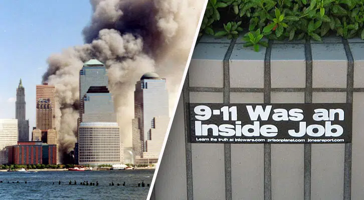 Bild: NY-Rauch: Wally Gobetz; Sticker: 911conspiracy (beide Wikimedia Commons, CC BY 2.0); Komposition: Wochenblick / Eigenes Werk