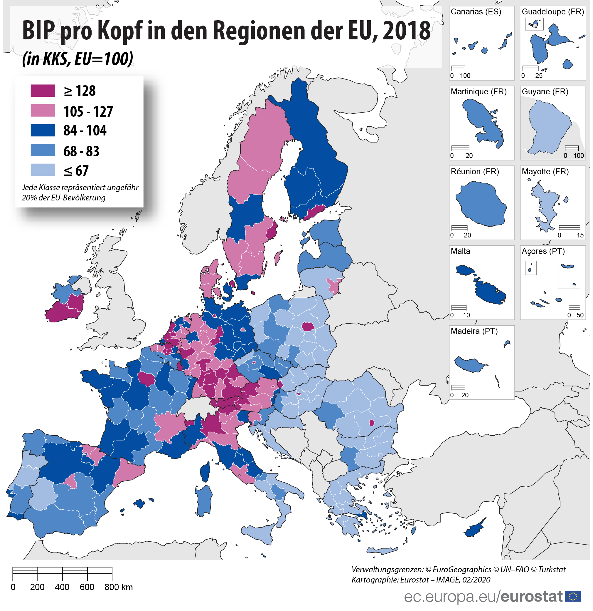 Zurück zu BIP pro Kopf in den Regionen der EU: Regionales BIP pro Kopf 2018 reichte im Jahr 2018 von 30% bis 263% des EU-Durchschnitts