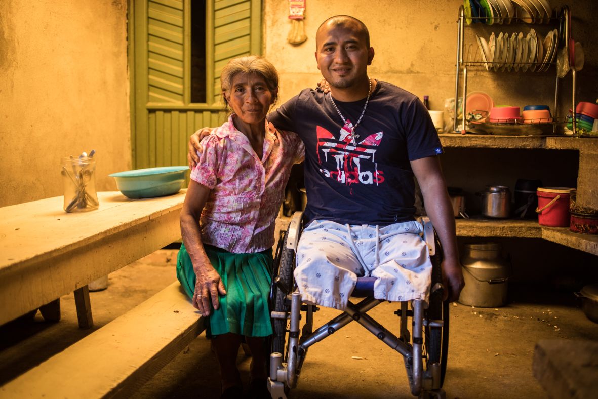 Jesús Albeiro Urbano mit seiner Mutter Ismailinea Aza, 63. Jesus ist Minenopfer, verlor beide Beine (Oberschenkelamputiert), geht zur Schule und arbeitet als Fahrer, in dem er Kinder mit seinem eigenen Bus zur Schule fährt. Bild: "obs/Caritas international/Lena Mucha"