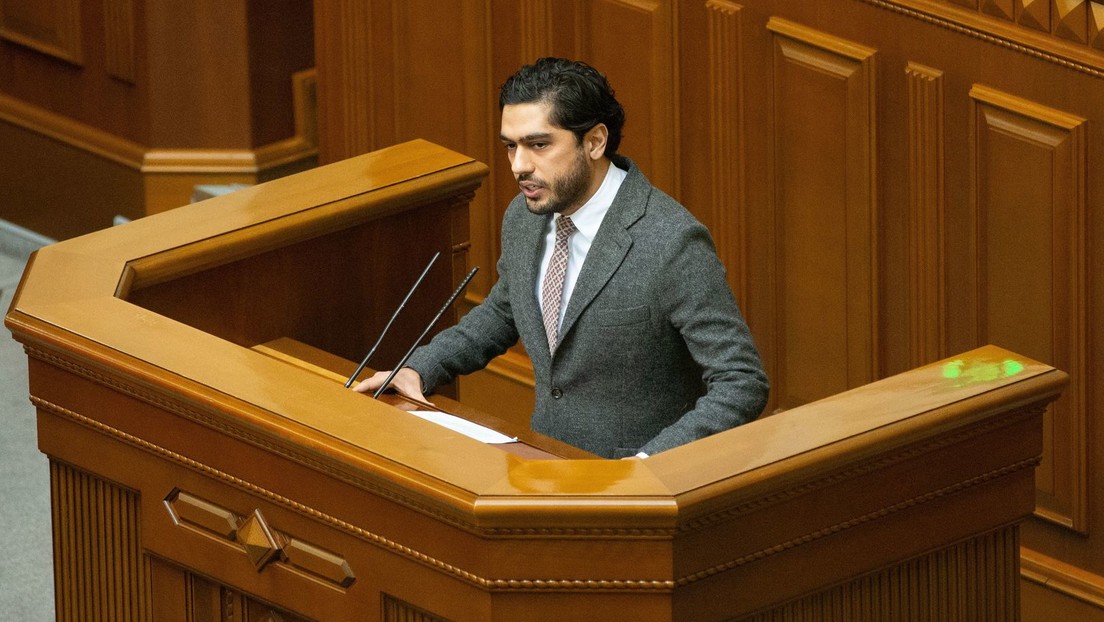 Der fraktionslose Abgeordnete Geo Leros bei seiner Rede während der ersten Plenarsitzung der Werchowna Rada der Ukraine im Jahr 2021, 26. Januar 2021. Bild: Sputnik / Stringer/РИА Новости
