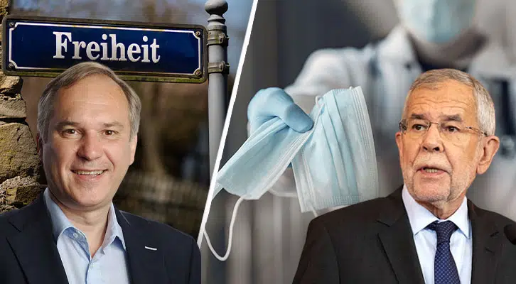 Bild: Straßenschild: Markus Kniebes, Flickr (public domain); Masken: Freepik; Rosenkranz: Rosenkranz (2013): FPÖ Niederösterreich, Wikimedia Commons (Attribution); vdB: Peter Lechner, CC BY-SA 4.0, via Wikimedia Commons; Collage: Wochenblick / Eigenes Werk