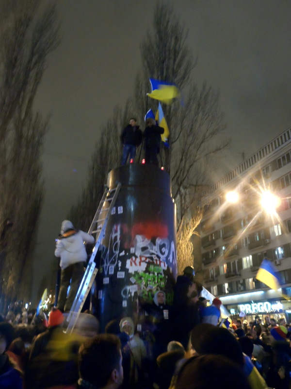 Ukraine: Demonstranten auf dem Sockel der gestürzten Lenin-Statue, den 8. Dezember 2013