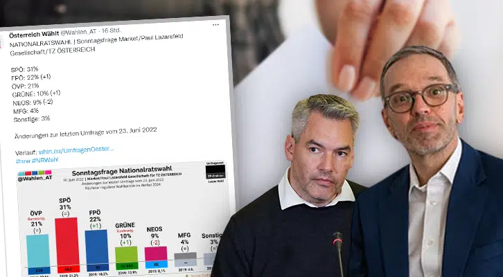 Bild: Kickl: (C) Alois Endl; Nehammer: President of Ukraine, Flickr (public domain); Hintergrund: Freepik; Umfrage: Screenshot Twitter; Komposition: Wochenblick / Eigenes Werk