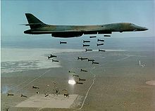 Ein US-amerikanischer B-1-Bomber wirft 30 „Cluster-Bomben“ ab. Bild: de.wikipedia.org