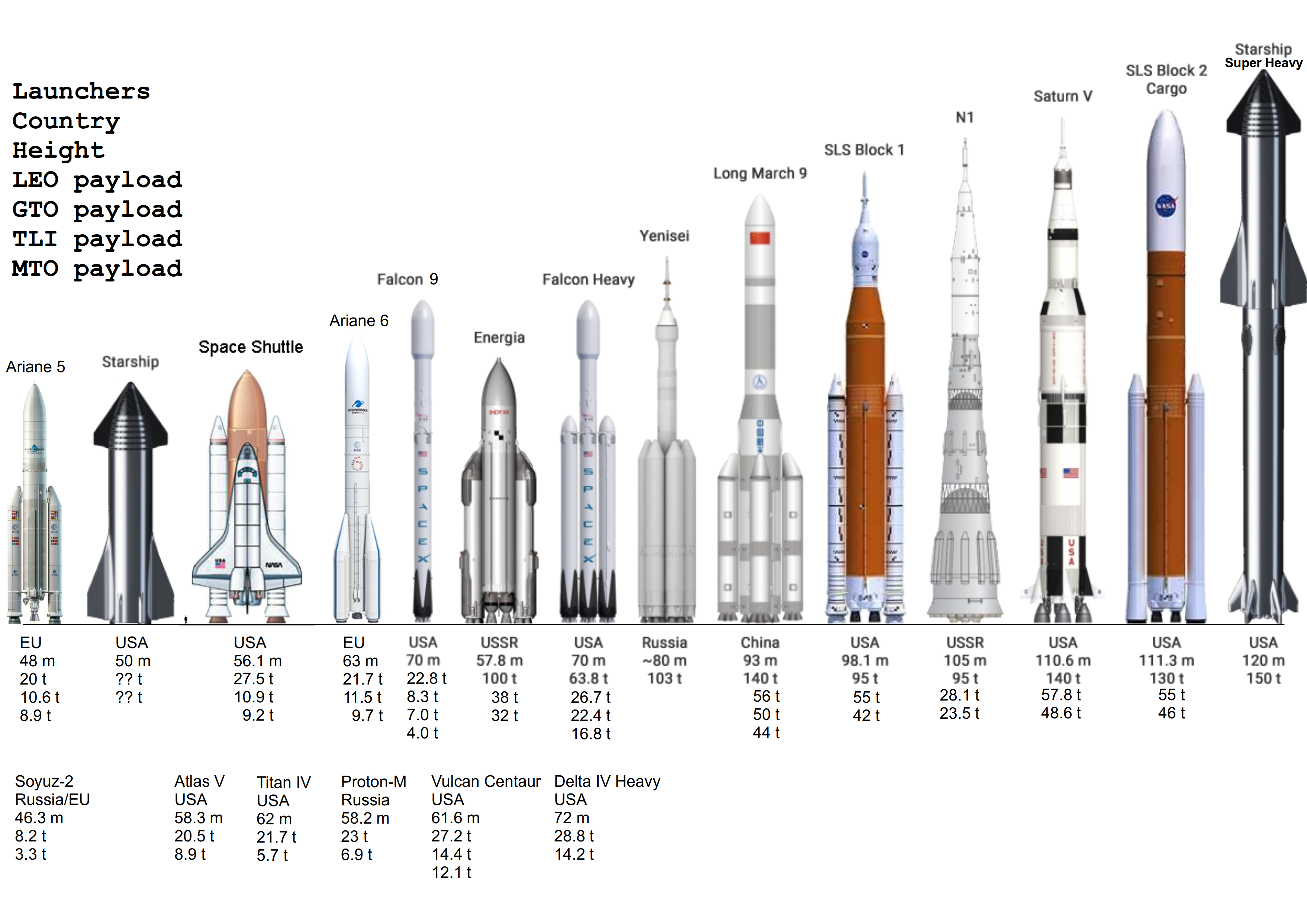 Überblick von ausgewählten Trägerraketen; Starship Super Heavy ist die höchste je gebaute Trägerrakete.